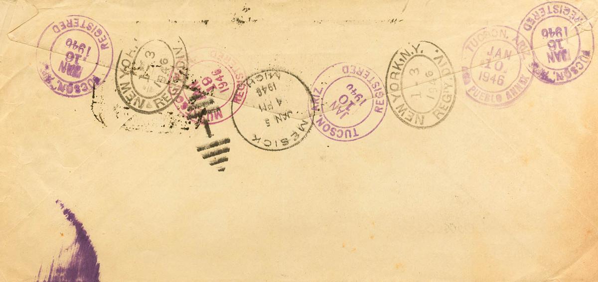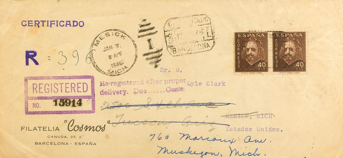 989(2). 1946. 40 cts castaño, pareja. Certificado de BARCELONA a MESICK (U.S.A.), reexpedida a MUSKEGON (membrete Filatelia Cosmos). Al dorso tránsitos y llegadas. MAGNIFICA Y RARA.