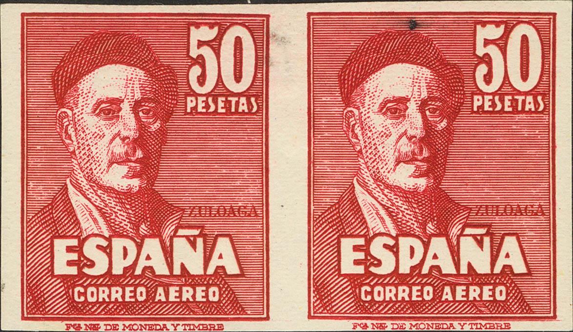 ★ 1016s(2). 1947. 50 pts carmín, pareja (conservación habitual). SIN DENTAR. MAGNIFICA Y RARA. Cert. CEM. Edifil 2022: +2.900 Euros