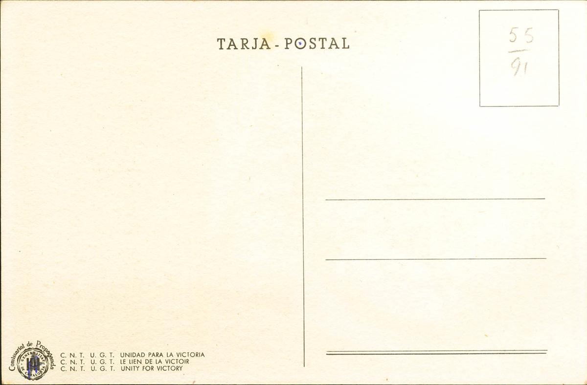 (★)(1938ca). Tarjeta Postal del Comisariado de Propaganda CNT, UGT. UNITAT OBRERA PER A AIXAFAR EL FEIXISME. MAGNIFICA Y RARA. (Allepuz 318)