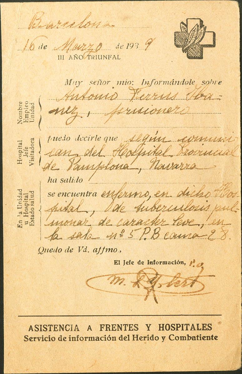1939. Tarjeta Postal de Asistencia a Frentes y Hospitales. Correo Interior de BARCELONA. Marca de franquicia, en azul y censura en negro. MAGNIFICA.