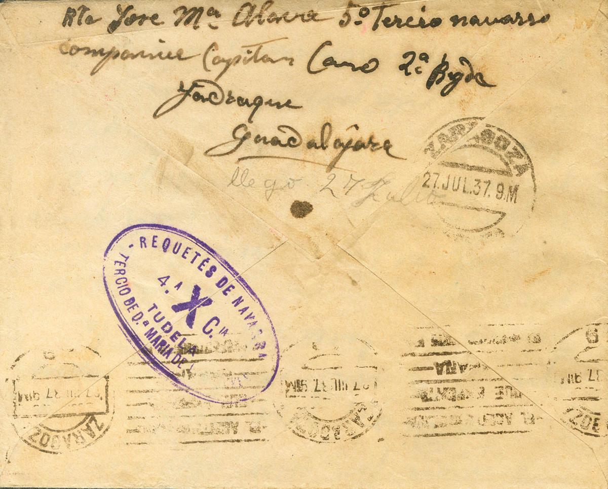 1937. Sobre con membrete "Un Caudillo Franco" de JADRAQUE (GUADALAJARA) a ZARAGOZA. Marca REQUETES DE NAVARRA 4ª CIA / TUDELA / TERCIO DE Dª MARIA DE LAS NIEVES, en violeta y al dorso llegada. MAGNIFICA.