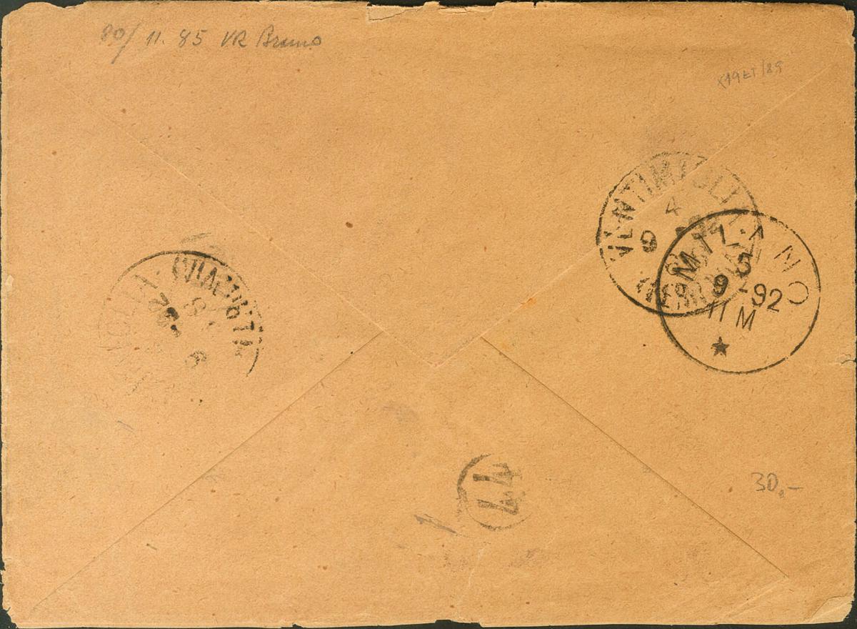 219. 1892. 15 cts castaño lila y 10 cts verde bronce TIMBRE MOVIL (1892). VILLAFUFRE (CANTABRIA) a MILAN (ITALIA). Matasello cartería SANTANDER / VILLAFUFRE y tasada a la llegada con 20 centésimas, aplicando dos sellos de tasa italianos de 10 cts (reverso desprendido del frente, encajando perfectamente). BONITA Y RARA.