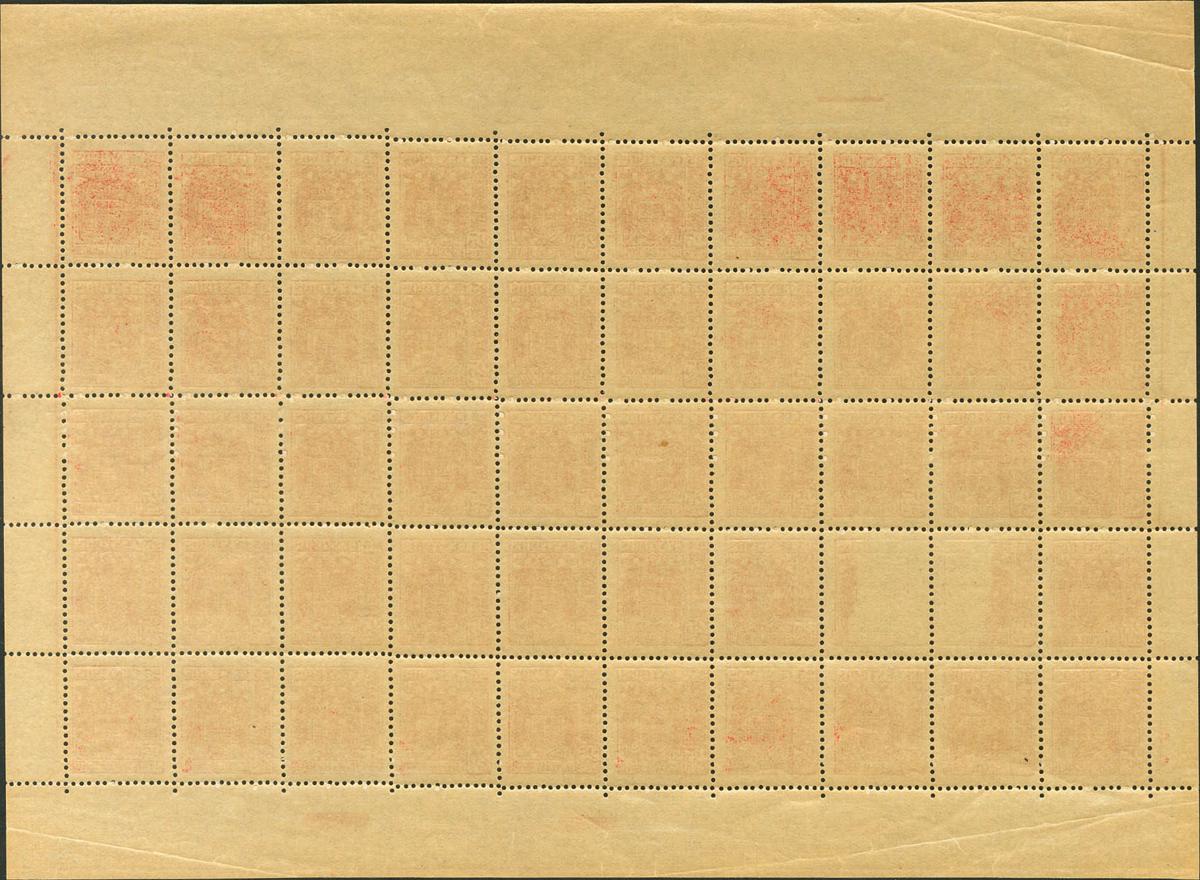 ★★1940. 25 cts rojo TIMBRE MOVIL, pliego completo de cincuenta sellos. Variedad FALTA DE IMPRESION en dos sellos. MAGNIFICO.
