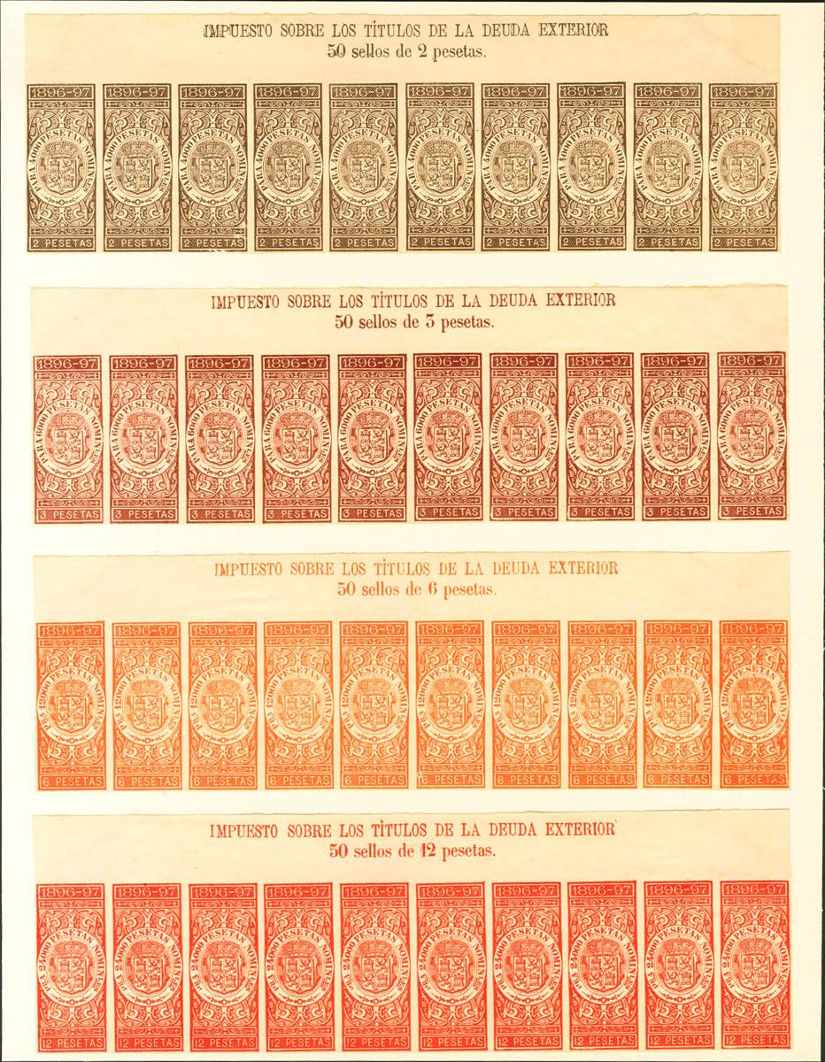 ★★/★1896. Serie completa, ocho valores en tiras de diez, cabecera de pliego. TITULOS DE DEUDA EXTERIOR. SIN DENTAR. MAGNIFICA Y MUY RARO CONJUNTO. (Alemany 1/8)
