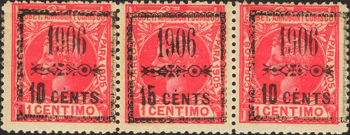 ★ 34A(2), 34Ahe. 1906. 10 cts on 1 cts, two stamps and 15 cts on 1 cts, united in strip of three. OVERLOAD WITH DIFFERENT VALUE IN THE STAMP OF 15 CTS. MAGNIFICENT.