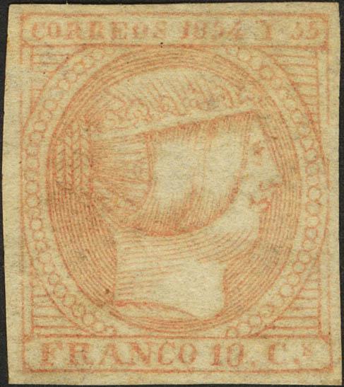★ 2d. 1854. 10 pink cuartos . LUXURY PIECE AND RARE SHADE OF COLOR, ESPECIALLY IN THIS SPECTACULAR QUALITY. Certificate CEM. Edifil 2019: 1,275 Euros