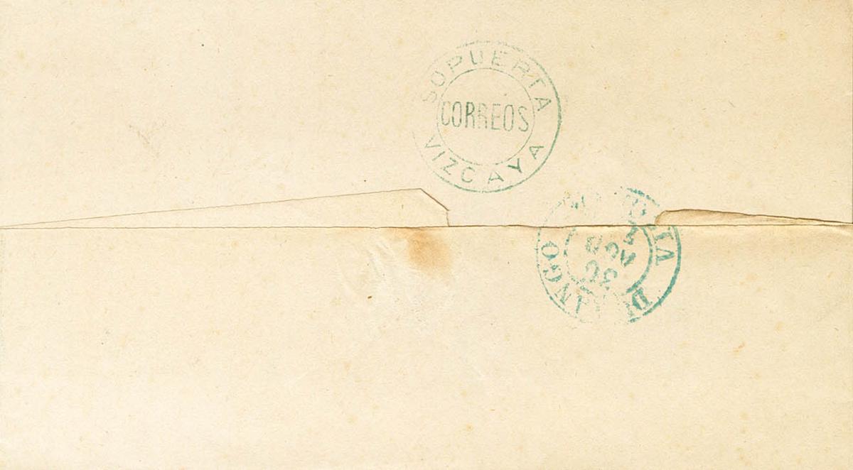 1874. (August). SOMORROSTRO to DURANGO. SOMORRSOTRO / CORREOS / VIZCAYA mark, in blue and DURANGO / VIZCAYA date stamp on the back and SOPUERTA / CORREOS / VIZCAYA mark, both in blue.