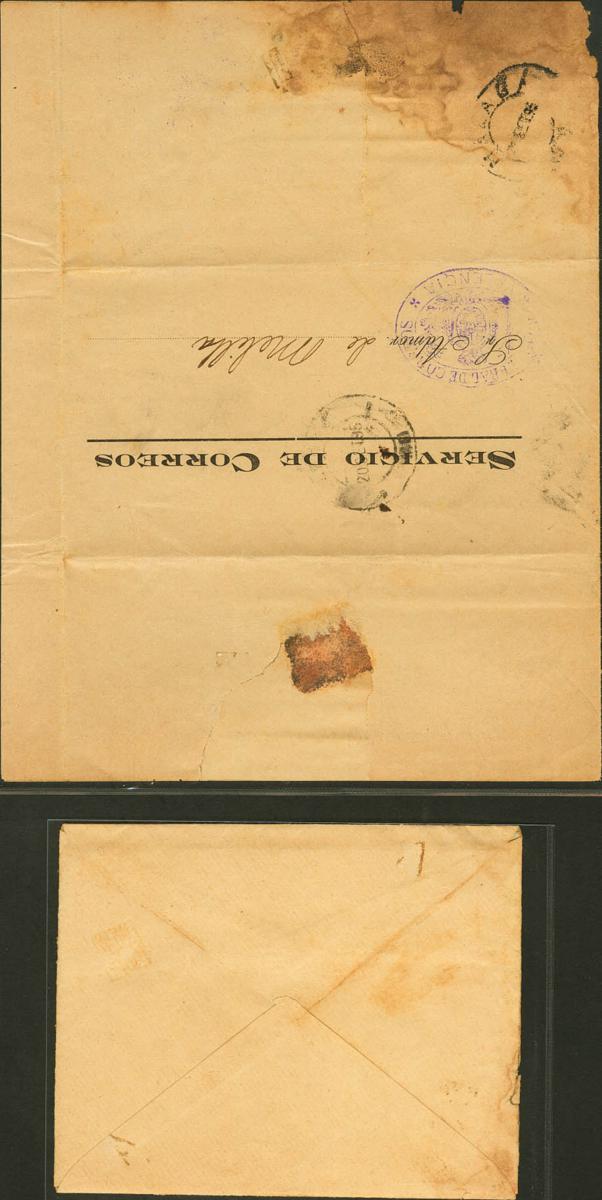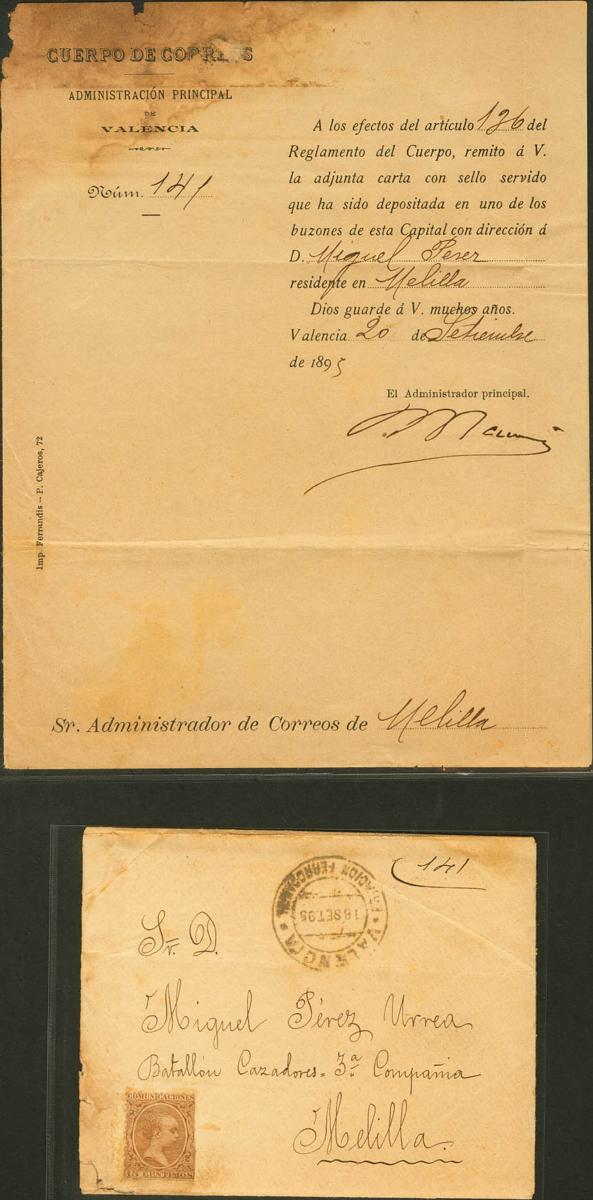 219. 1895. 15 cts lilac chestnut. VALENCIA to MELILLA. The main administration of Valencia detects that the seal has been previously used and sends a report that is attached to the administration of Malaga, on which Melilla depends. BEAUTIFUL AND UNUSUAL SET.