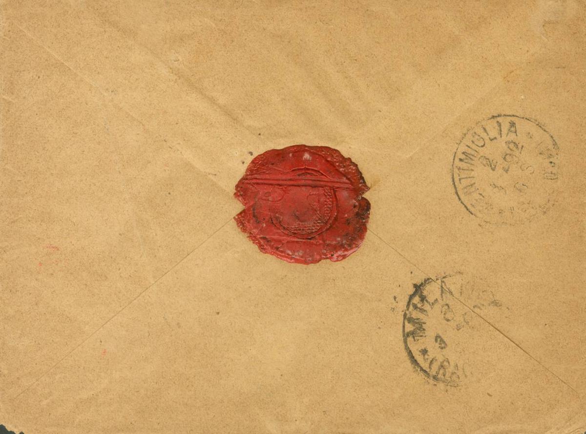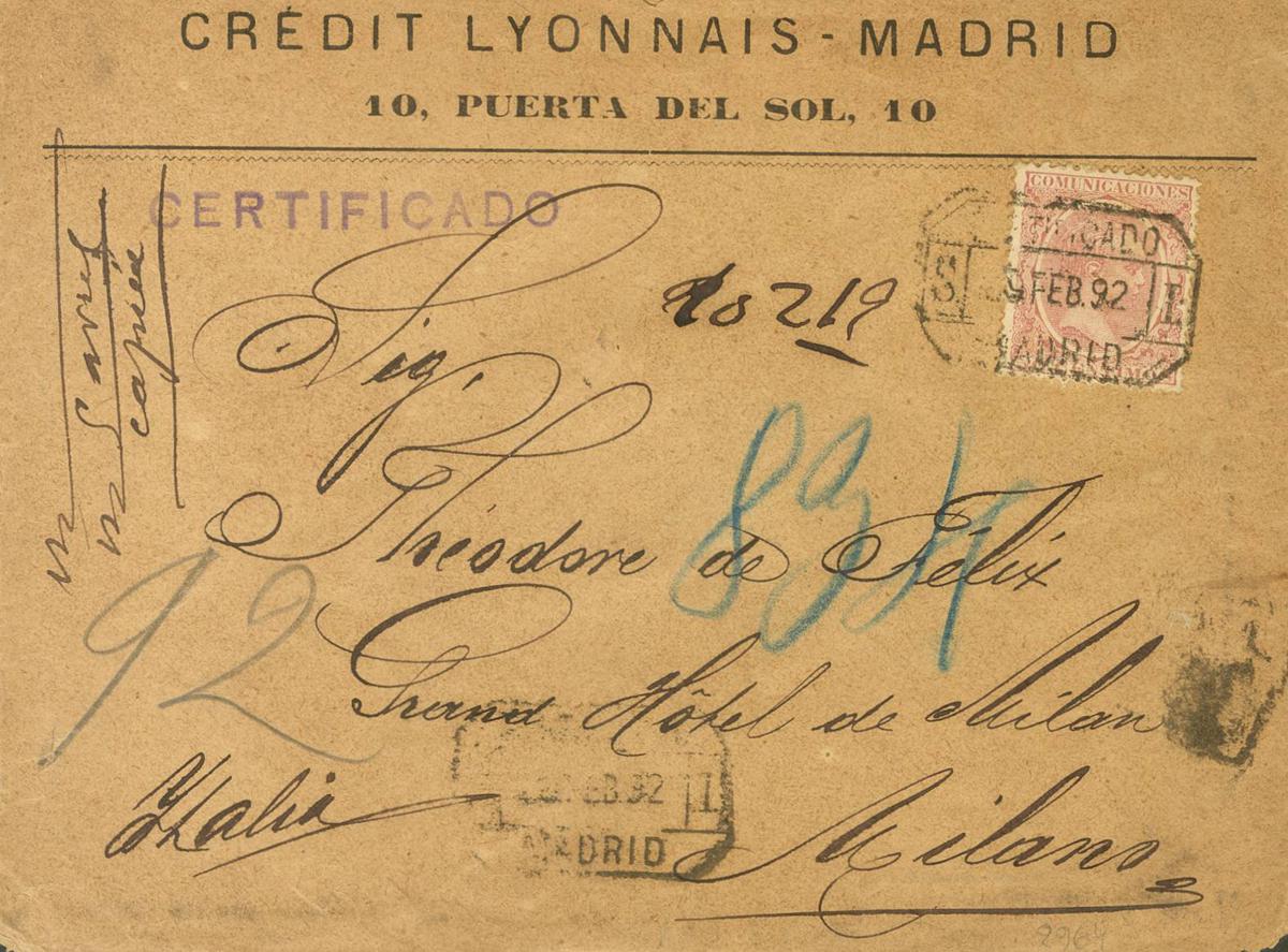 224. 1892. 50 cts carmine rose. Certificate from MADRID to MILAN (ITALY). On the back arrival. MAGNIFICENT.