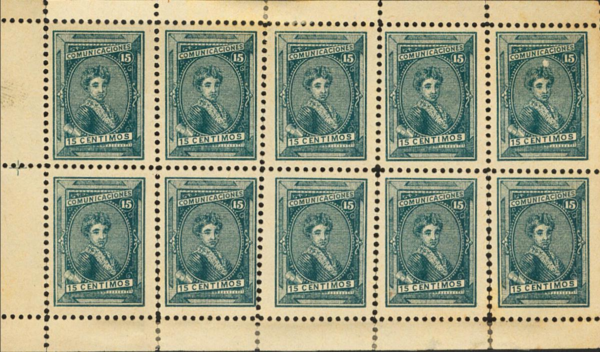 (★)1895. 15 cts slate blue, mini sheet of ten stamps (no right margin). DENTATED COLOR ESSAY, with the effigy of Alfonso XIII. PRETTY AND RARE IN FULL SHEET. (Galvez A97)