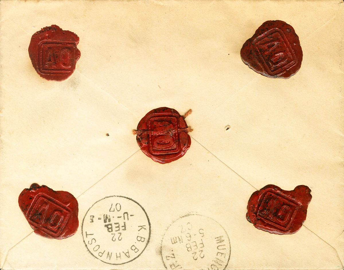 246, 252. 1907. 15 cts violet and 50 cts greenish blue. Declared Values from BARCELONA to MUNICH. On the front oval certificate mark canceled with ink crosses and arrival on the back. MAGNIFICENT.