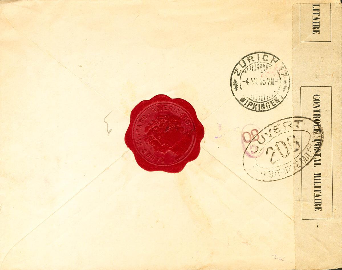 277. 1916. 50 cts blue, perforated BHA Certificate from MADRID to ZURICH (SWITZERLAND). CERTIFIED postmark / REACH NORTH / MADRID, arrival back. MAGNIFICENT.