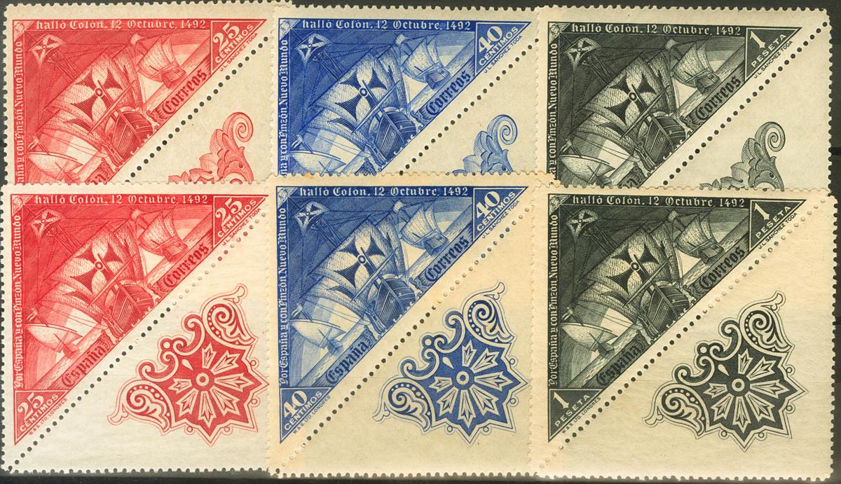 English ★ 539/43b, 539/43ba. 1930. 25 cts carmine, 40 cts blue and 1 pts black, two stamps of each value with Types A and B embellishments. MAGNIFICENT AND UNUSUAL SET. Edifil 2020: 121 Euros