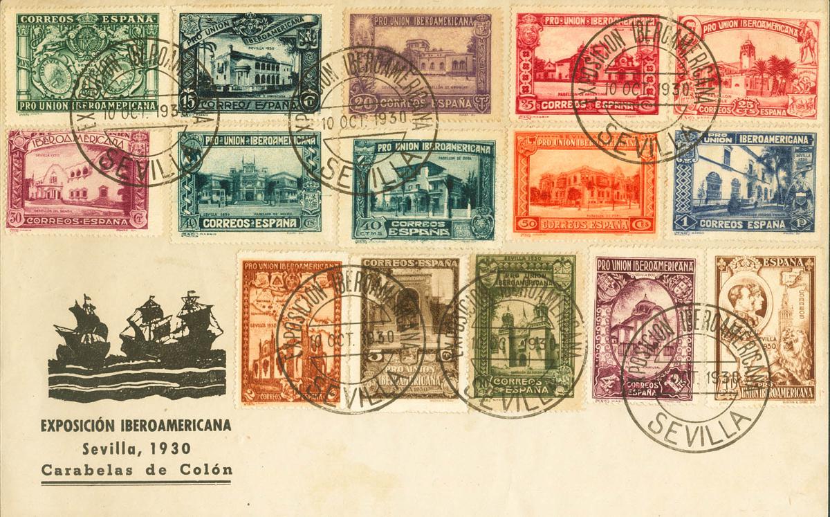 English 566/80. 1930. Complete series, in the absence of 10 pts (engraving) and urgent. Uncirculated cover with postmark IBEROAMERICAN EXHIBITION / SEVILLE. MAGNIFICENT.