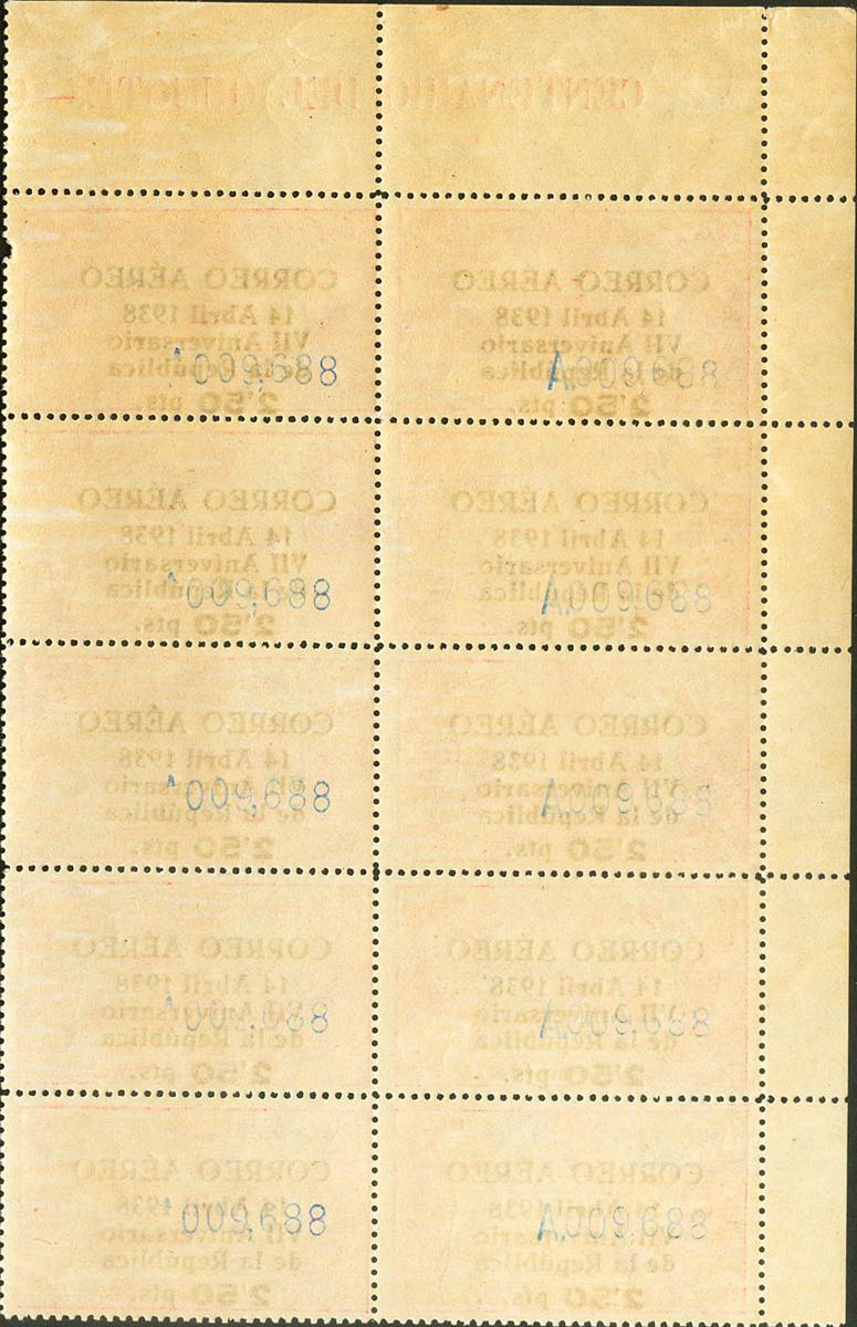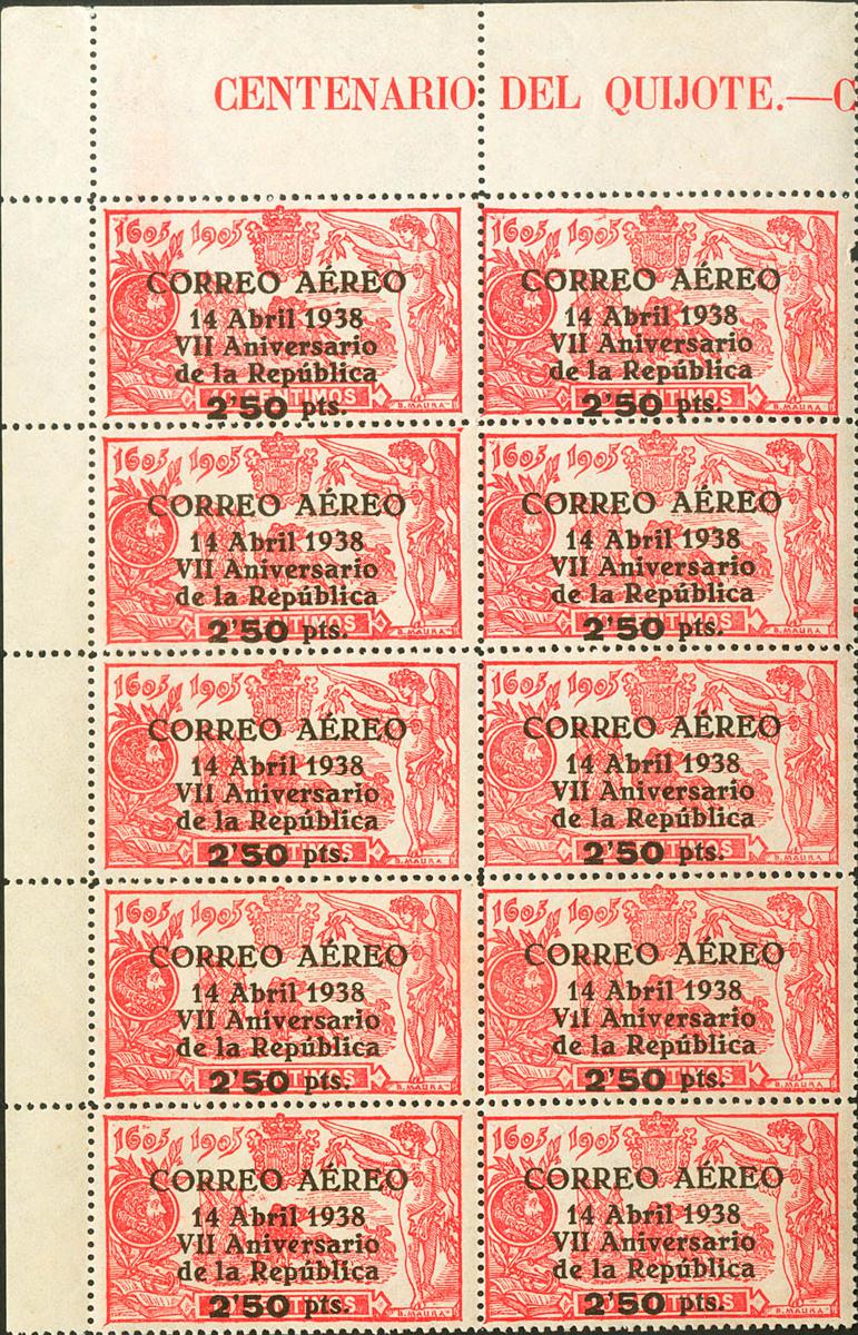 ★★ 756(10). 1938. 2.50 pts on 10 red cts, block of ten, sheet corner (some stamps with a variety of overload and five stamps with exceptional centering, one of which has a small defect on a regular centering). MAGNIFICENT AND VERY RARE. Building 2022: Edifil Euros