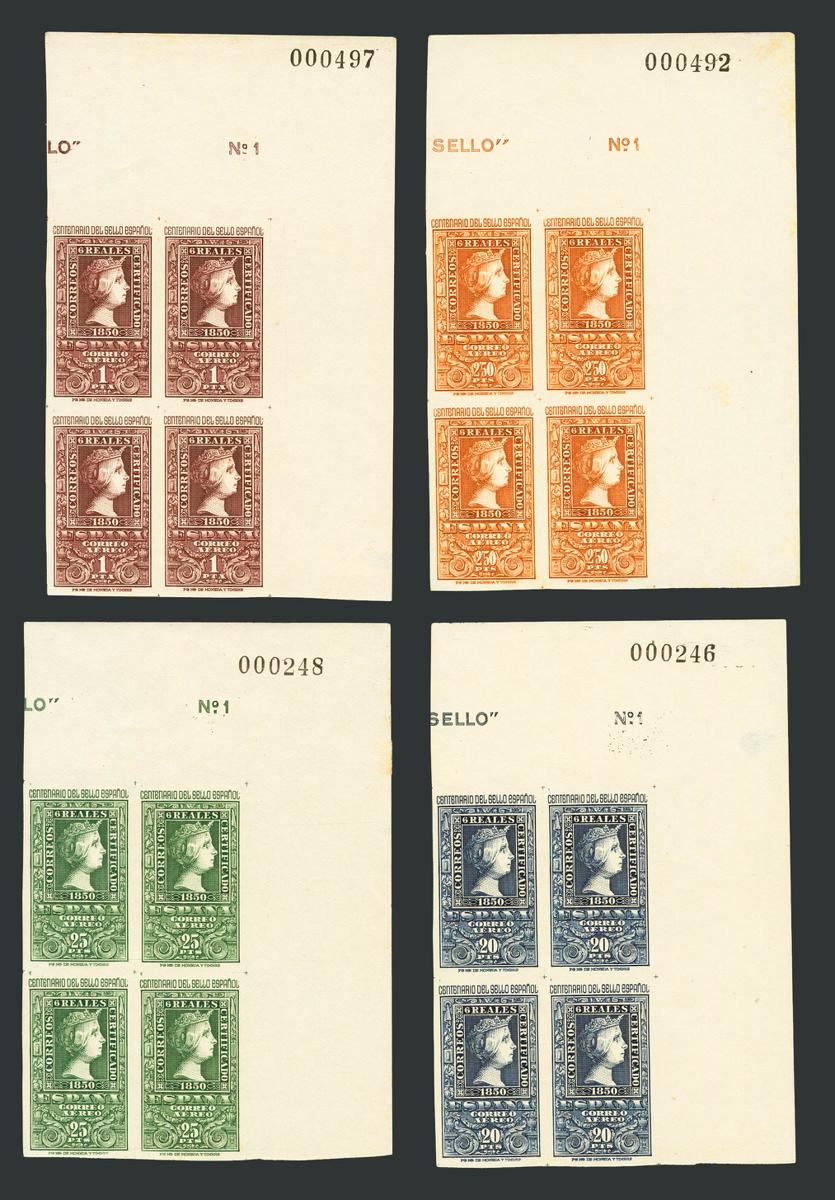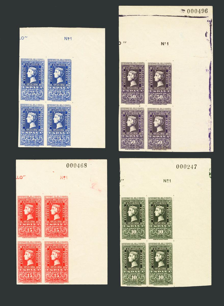 ★★ 1075/82(4). 1950. Complete series, block of four, numbered sheet corner (except the 75 cts, which is a sheet corner without number). MAGNIFICENT. Building 2022: Edifil Euros
