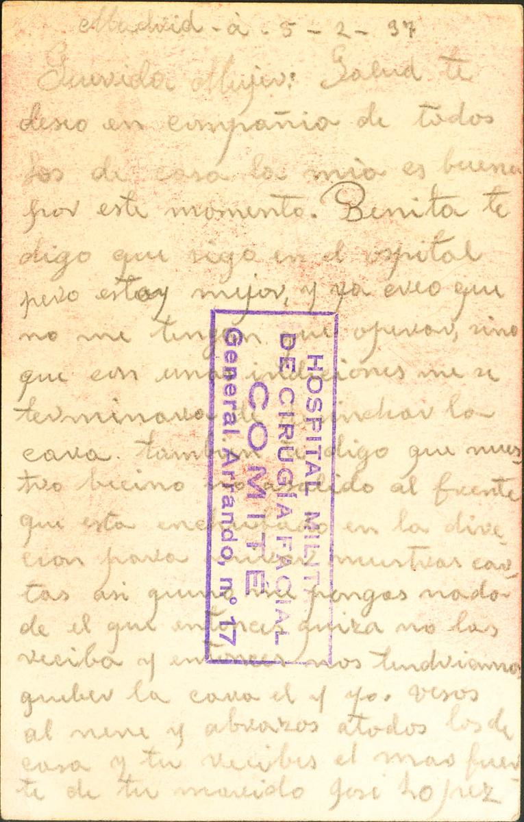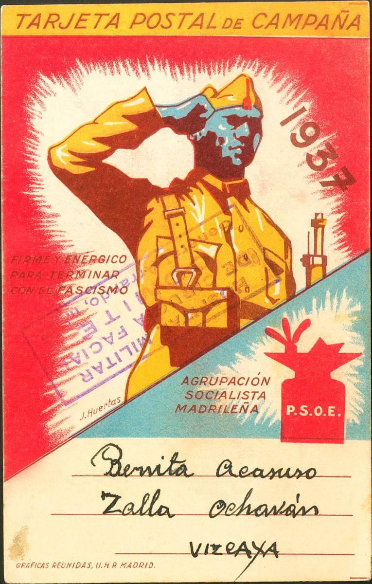 1937. Post Card of the PSOE Campaign FIRM AND ENERGICAL TO END FASCISM. MADRID to ZALLA (BIZCAYA). Mark on front and back MILITARY HOSPITAL / FACIAL SURGERY / COMITE / GENERAL ARRANDO Nº17, in violet. MAGNIFICENT AND RARE. (Allepuz 208)
