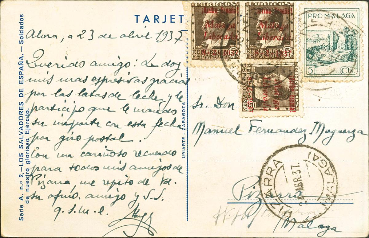 1937. 5 cts black chestnut, three seals and Beneficial 5 cts greenish blue. Illustrated Postcard of LOS SALVADORES DE ESPAÑA (Series A, Nº2) from ALORA (MALAGA) to PIZARRA (MALAGA). MAGNIFICENT AND RARE.