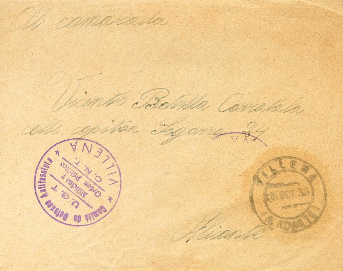 1936. VILLENA to ALICANTE. Brand ANTI-FASCIST DEFENSE COMMITTEE / UGT / MILITIAS AND / PUBLIC ORDER / CNT / VILLENA, in purple. MAGNIFICENT AND RARE.