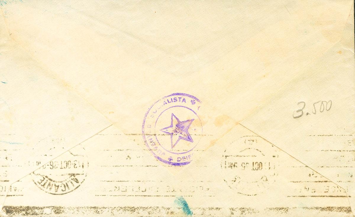 English 1936. DEIFONTES (GRANADA) to ALICANTE. Marks JUVENTUD SOCIALISTA / DEIFONTES (GRANADA) and triangular ESTAFETA CAMPAÑA / CORREOS / FRONT OF GRANADA, both in violet and arrival on the back. MAGNIFICENT AND RARE.