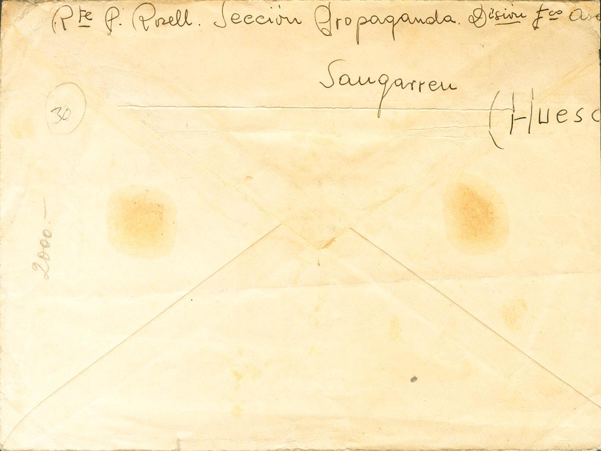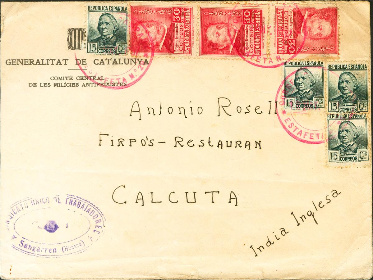 English 726(3), 683(4). (1936ca). 30 cts carmine, three stamps and 15 cts slate, four stamps. SANGARREN (HUESCA) to CALCUTTA (BRITISH INDIA). Postmark CORREO DE CAMPAÑA / ESTAFETA Nº2, in red and on the front marks SINDICATO UNICO DE TRABAJADORES / CNT / SANGARREN (HUESCA), in violet. MAGNIFICENT AND VERY RARE, ESPECIALLY WITH THIS UNUSUAL DESTINATION.