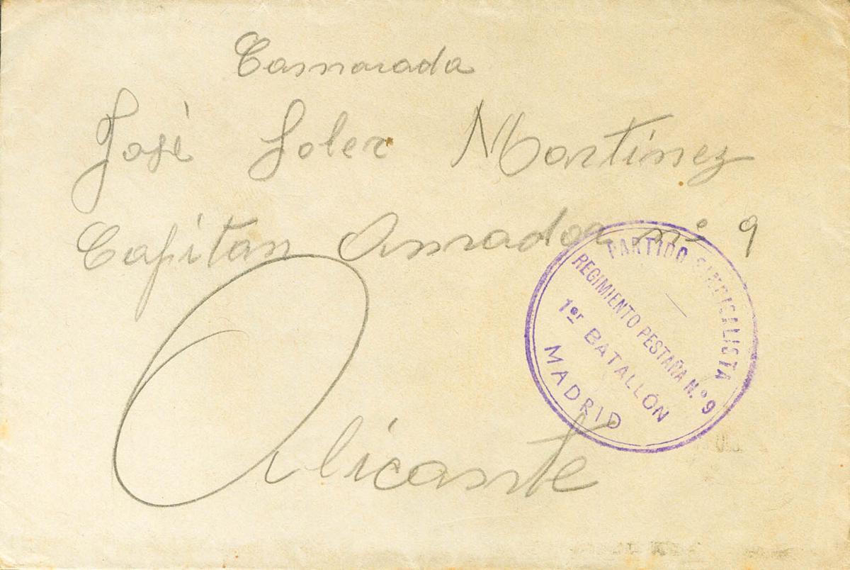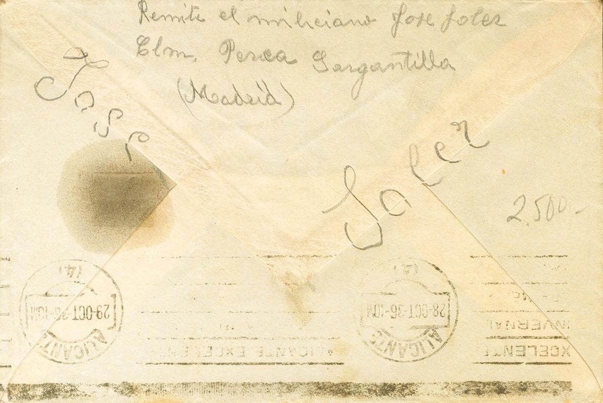 1936. NECKLACE FROM LOZOYA (MADRID) to ALICANTE. Mark SINDICALIST PARTY / PESTAÑA REGIMENT Nº9 / 1ST BATTALION / MADRID, in violet (named after Angel Pestaña, belonging to the Syndicalist Party), on arrival back. MAGNIFICENT AND RARE.