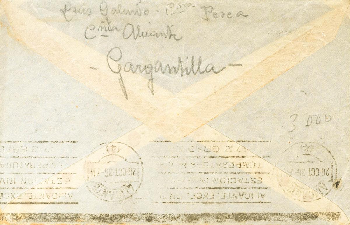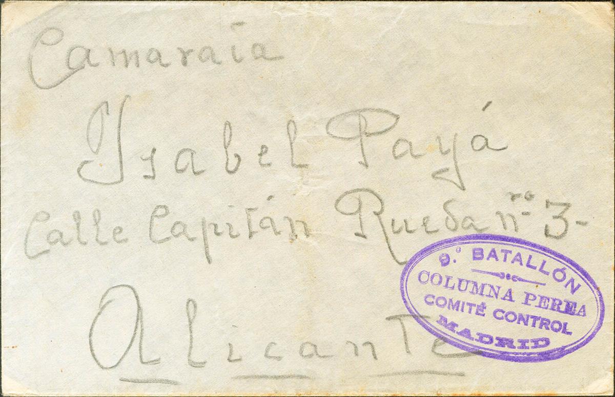 1936. LOZOYA GANGANTILLA to ALICANTE. Mark 9º BATTALION / PEREA COLUMN / CONTROL COMMITTEE / MADRID, in purple (the Perea Column was assigned to the Lozoya front and part of the Sierra de Madrid, named after its commander Juan Perea Capulino). MAGNIFICENT AND RARE.