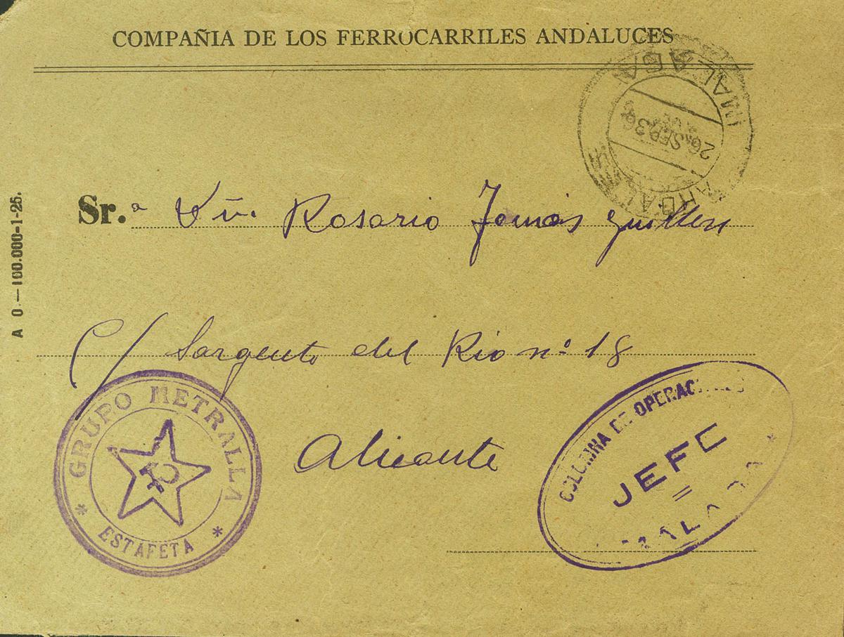 1936. Cover with letterhead from the Andalusian Railway Company of ALORA (MALAGA) to ALICANTE. Dater ARDALES / (MALAGA) and marks GRUPO METRALLA / ESTAFETA and COLUMNA DE OPERACIONES / JEFE / MALAGA, both in violet and arrival on the back. MAGNIFICENT AND EXTRAORDINARILY RARE.