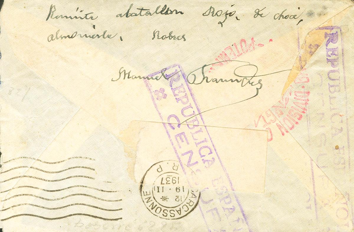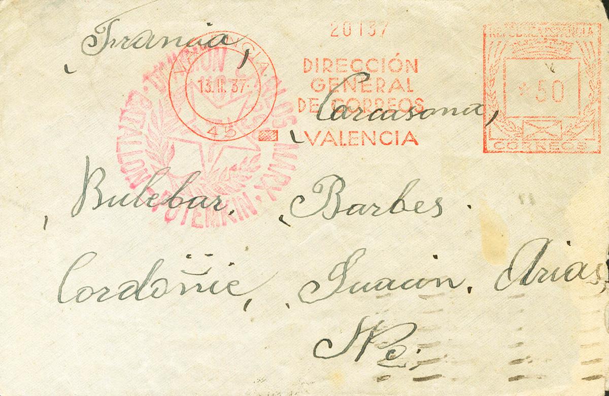 English 1937. 50 cts Mechanical postage. VALENCIA to CARCASONNE (FRANCE). Brand DIVISION CARLOS MARX / BATTALION POTEMKIN, in red and repeated on the back next to the arrival. MAGNIFICENT AND RARE.