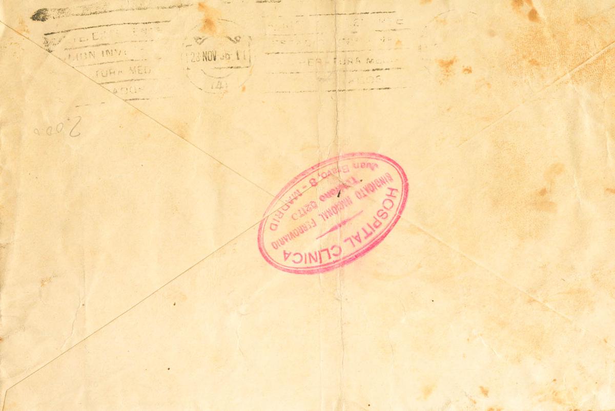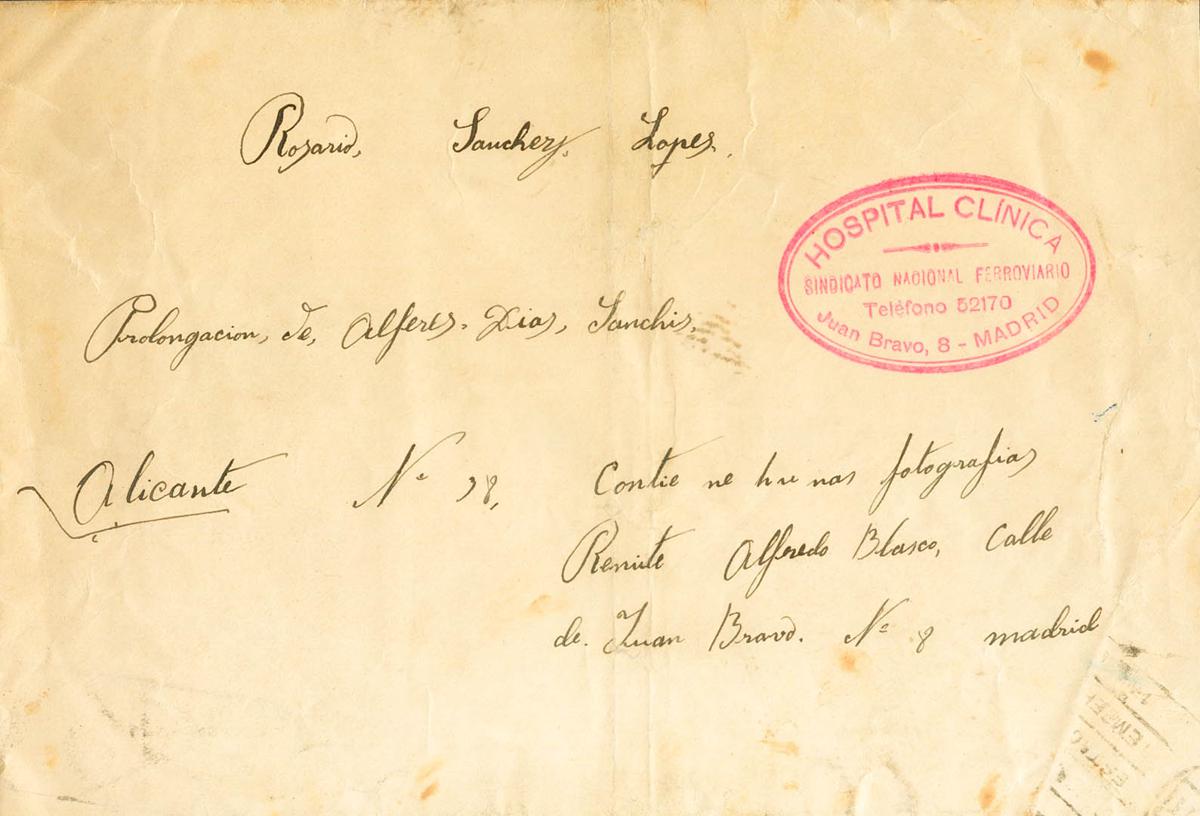 1936. MADRID to ALICANTE. Brand HOSPITAL CLINICA / NATIONAL RAILWAY UNION / TELEPHONE 52170 / JUAN BRAVO, 8-MADRID, in carmine red, repeated on the back next to the arrival. MAGNIFICENT AND RARE.