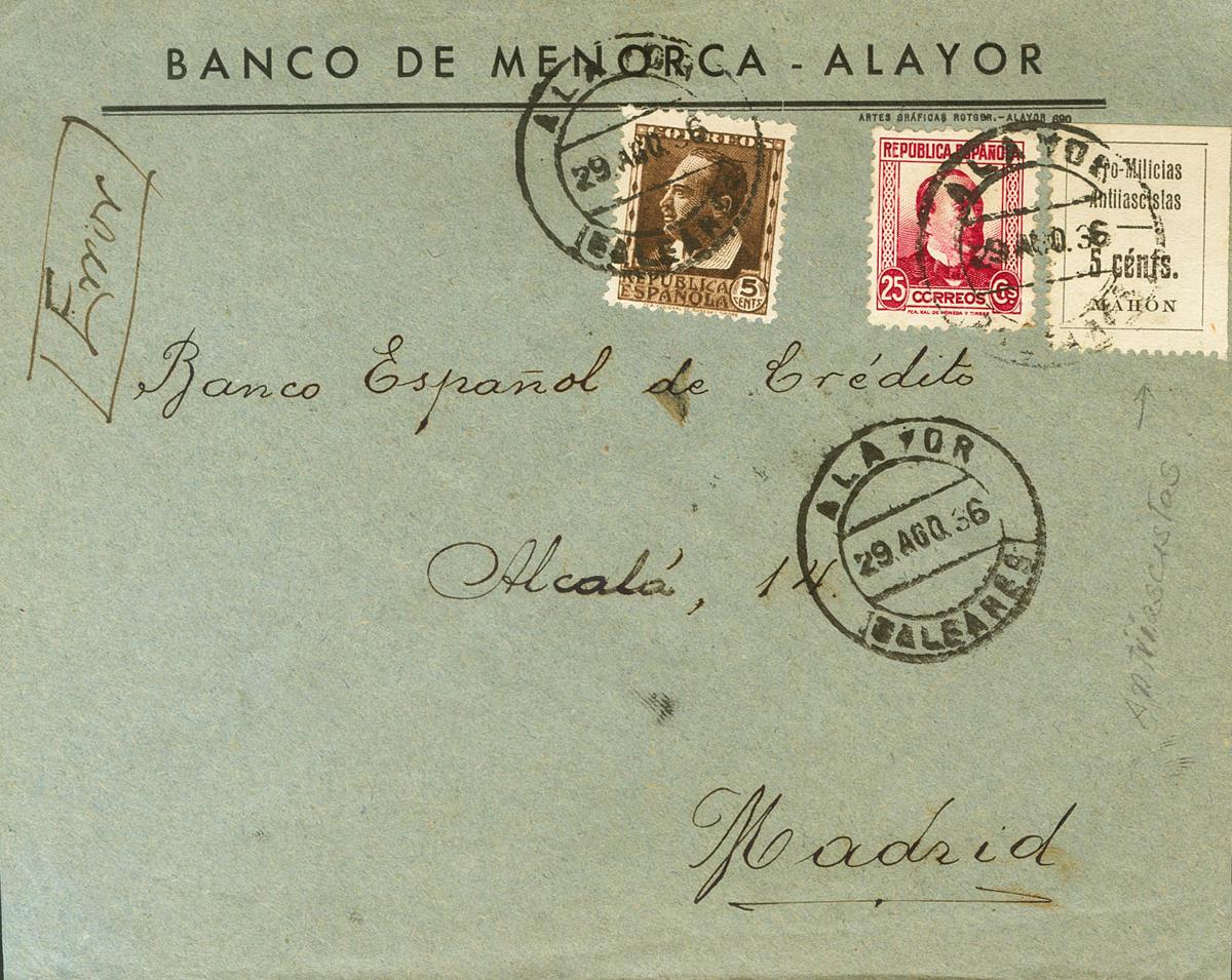 English 1936. 5 cts black chestnut, 25 cts carmine and 5 cts Local MAHON black. ALAYOR to MADRID. MAGNIFICENT. (Allepuz 1)
