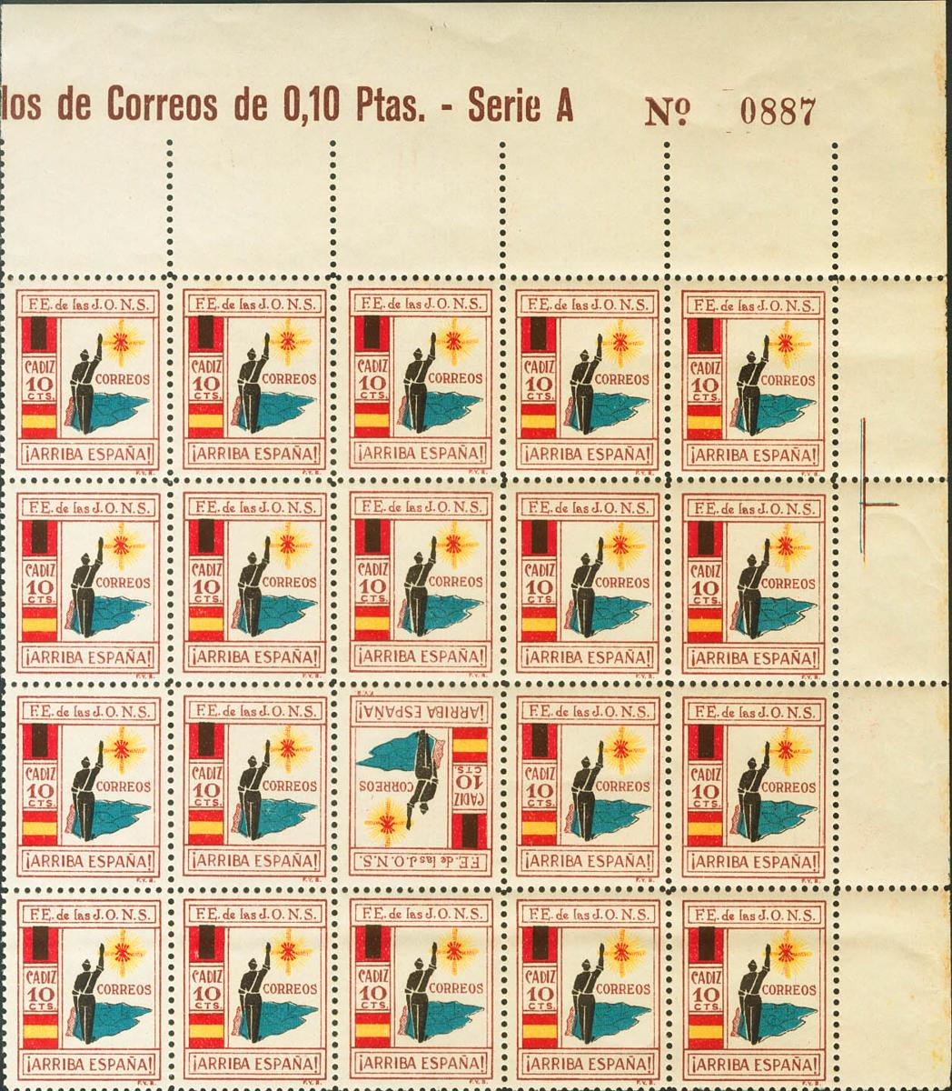 ★★1937. 10 multicolored cts, block of twenty with a REVERSED stamp. CADIZ. MAGNIFICENT AND RARE.