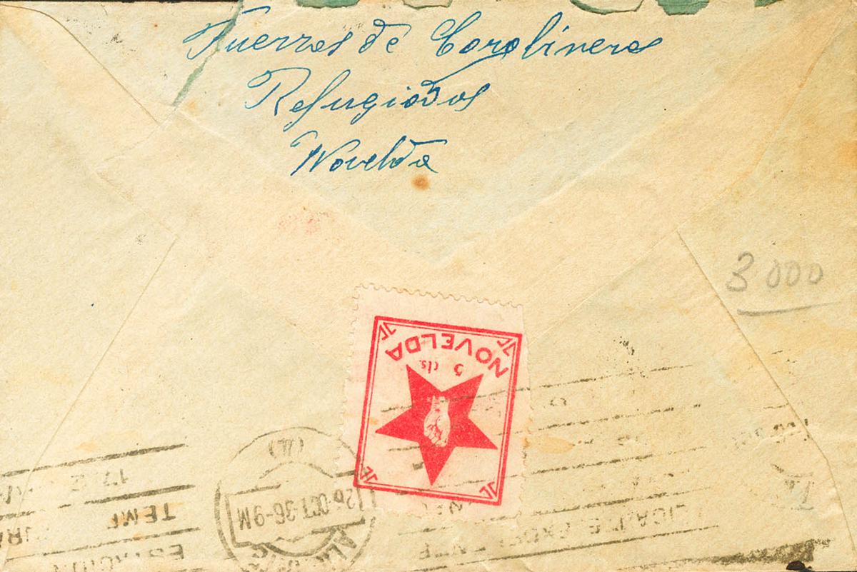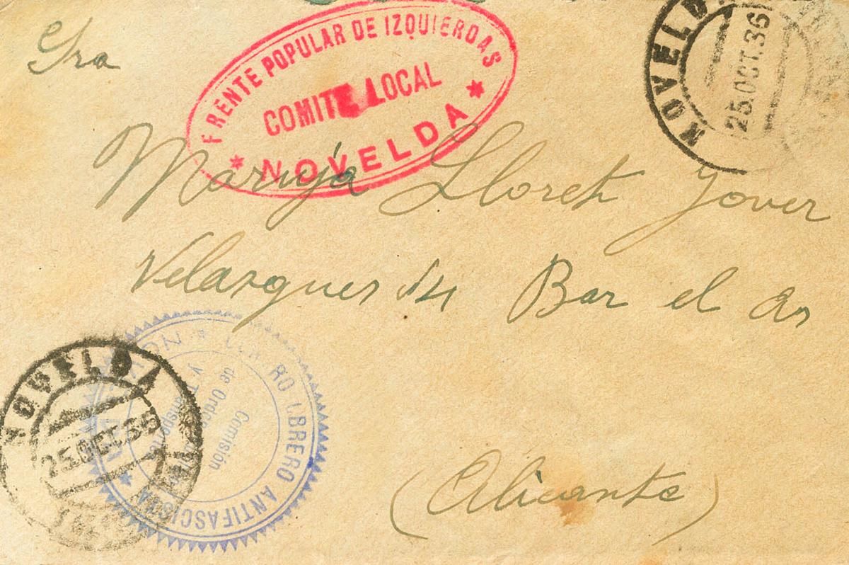 1936. 5 cts NOVELDA rose (frangible on the back). NOVELDA (ALICANTE) to ALICANTE. Marks POPULAR LEFT FRONT / LOCAL COMMITTEE / NOVELDA, in red and ANTI-FASCIST WORKERS CENTER / COMMISSION / OF PUBLIC ORDER / AND TRANSPORTS / NOVELDA, in violet and on the back refer Police Forces, Refugees, Novelda and arrival. MAGNIFICENT.