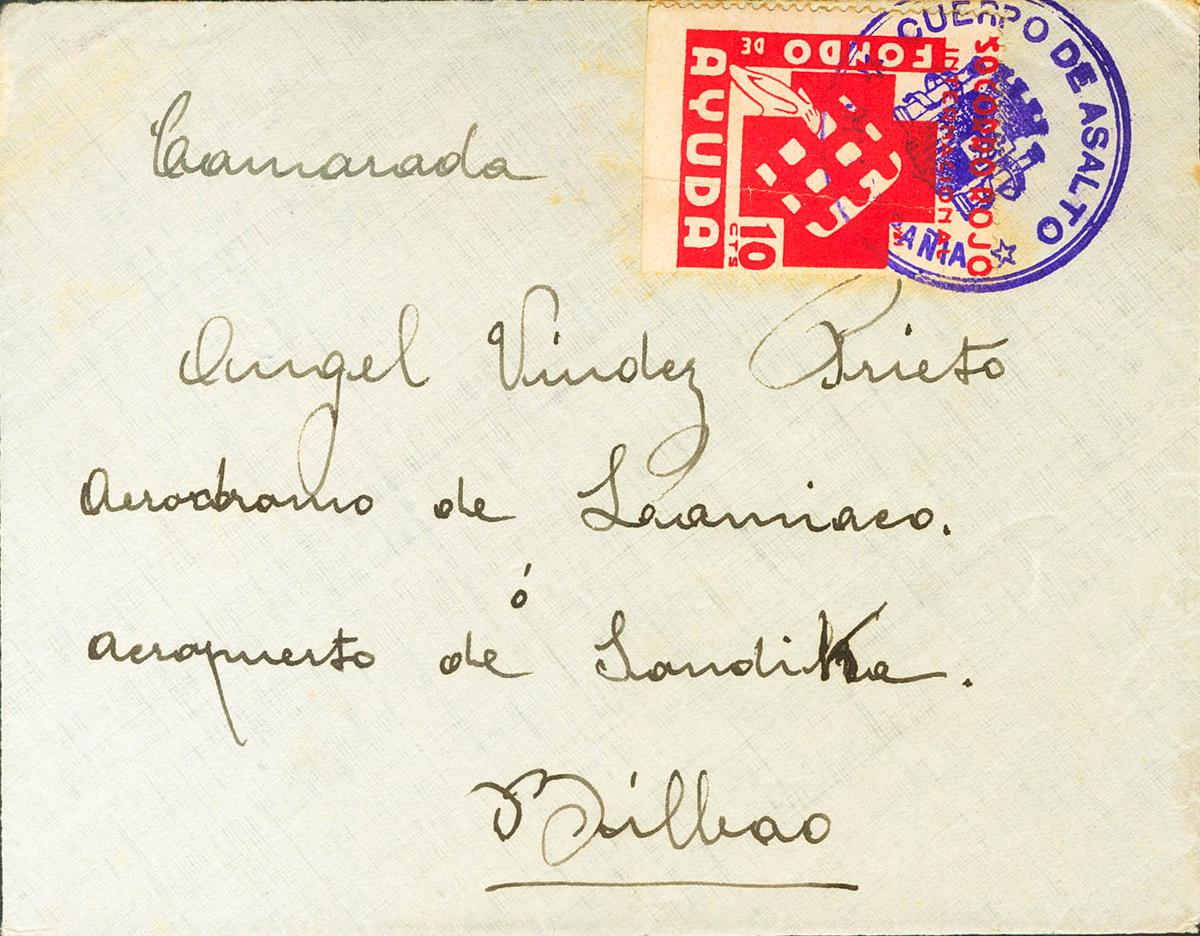 (1936ca). 10 red cts from the SRI AID FUND. Front directed to BILBAO. Postmark CORPO DE ASALTO / 31 COMPAÑIA, in violet. MAGNIFICENT AND RARE. (Allepuz 1088, Domenech 18)