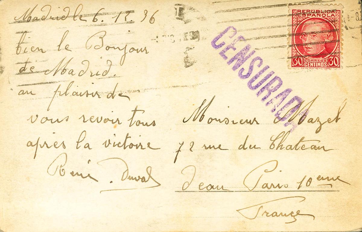 687. 1936. 30 cts carmine. Postal card from MADRID to PARIS (FRANCE), sent by the French brigade member René Duval outside the International Brigades postal service. MAGNIFICENT.