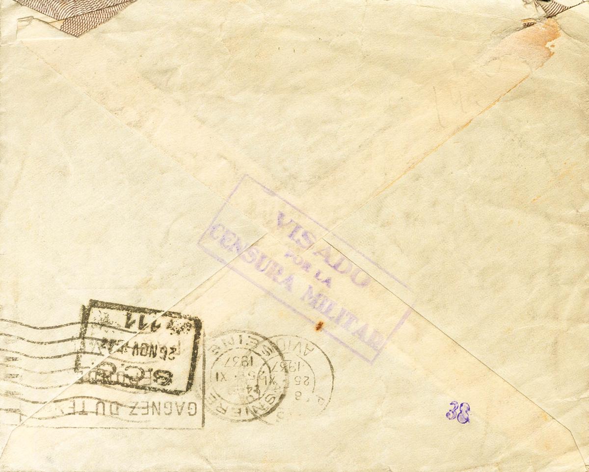 673, 681, 682(3). 1937. 1 slate pts, 5 chestnut cts and 10 green cts, three stamps. ALBACETE to ASNIERES (FRANCE). Postmark SCC / 111 and arrival on the back. MAGNIFICENT.