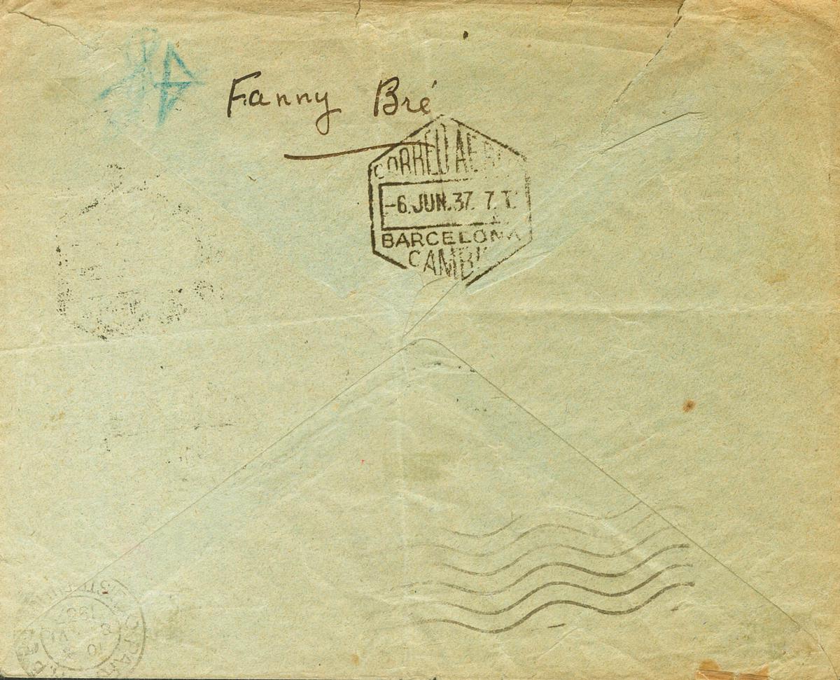 673, 682. 1937. 1 slate pts and 10 green cts. VALENCIA to PARIS (FRANCE), referred by Fanny Bre, alias Freda Breiman, of Franco-Roman origin, she was a nursing assistant at the International Brigades hospitals in Murcia, Cuenca and Barcelona. MAGNIFICENT AND RARE.