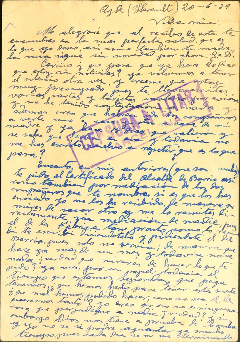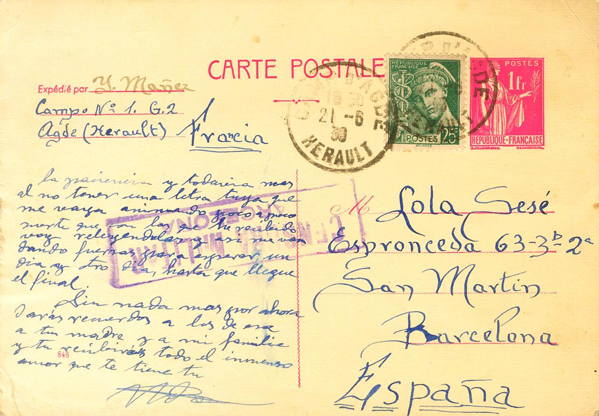 1939. 1 f pink envelope French Post Card from AGDE to BARCELONA, with complementary postage of 25 cts green, sent by a Spaniard interned in the Agde Concentration Camp. Postmark CAMP DE AGDE / HERAULT. MAGNIFICENT AND RARE USE OF ENTIRE POSTCARDS IN A SPANISH REFUGEE CAMP.