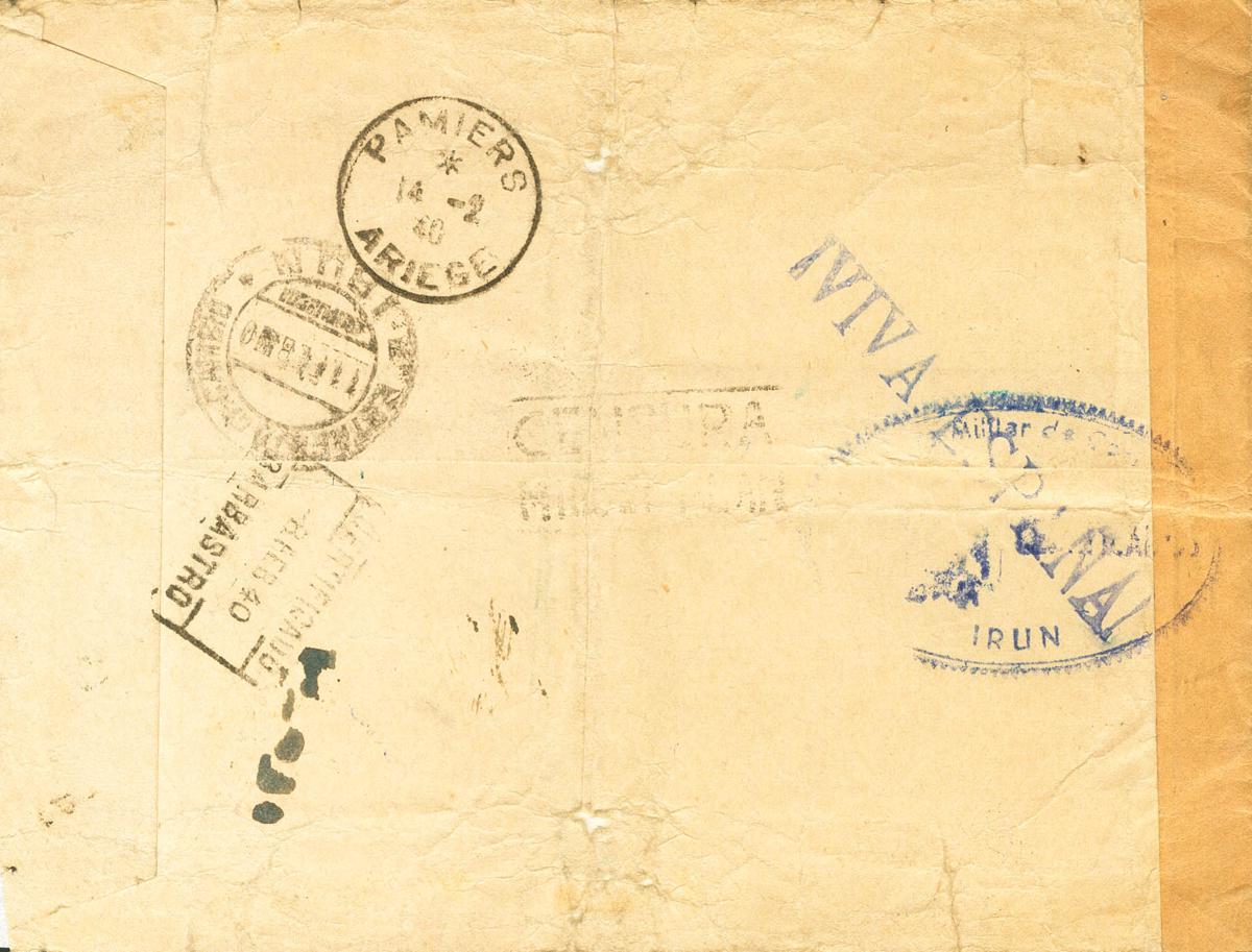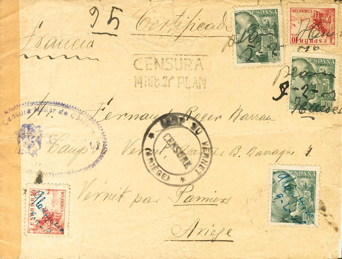 English 1940. 40 cts gray green, three stamps and 10 cts pink, two stamps. Certificate from PLAN (HUESCA) to VERNET (FRANCE), addressed to the Vernet Internment Camp. Unused pen stamps "Plan Huesca" and marks CENSURA / MILITAR PLAN and CAMP DUVERNET / CENSURE (ARIEGE) on the front, transits and arrival on the back. MAGNIFICENT AND RARE.