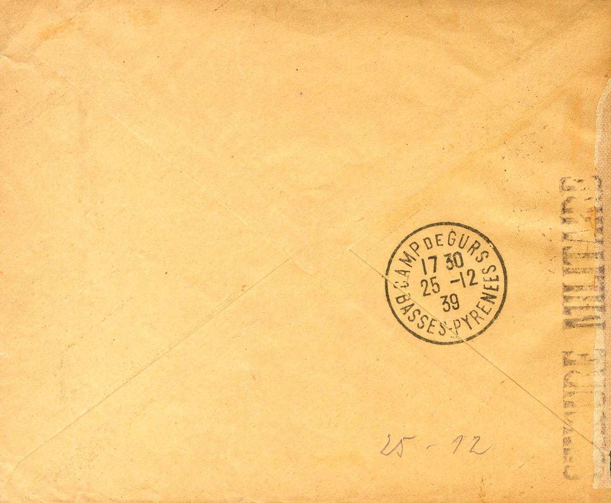 1939. 90 blue cts from France, surcharge F. BEYNAT a GURS, forwarded from the Beynat Provisional Camp to an Italian interned in the Gurs Camp. MAGNIFICENT AND RARE CIRCULATED BETWEEN DIFFERENT FIELDS.