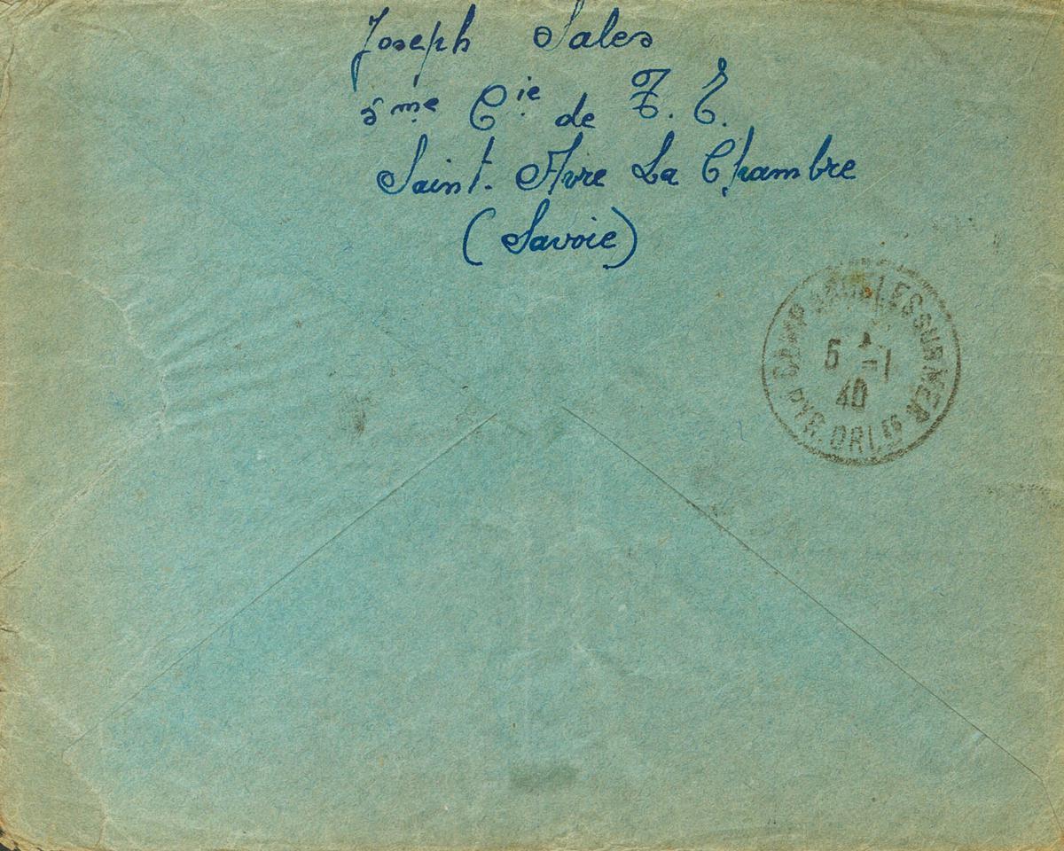 1940. Blue 90 cts from France, surcharge F. LA CHAMBRE to SAINT CYPRIEN, forwarded by a Spaniard from the 5th Company of Spanish Workers and addressed to the Saint Cyprien Concentration Camp. On the back arrival. MAGNIFICENT AND RARE.