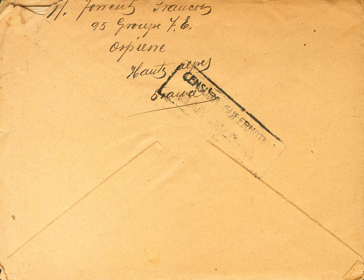 1941. 2´50 f blue from France. Letter (with text) from ORPIERRE to BARCELONA, sent by a Spanish nurse from the 95th Spanish Workers Group, established in this small town in the Altos Alpes department. MAGNIFICENT AND RARE.