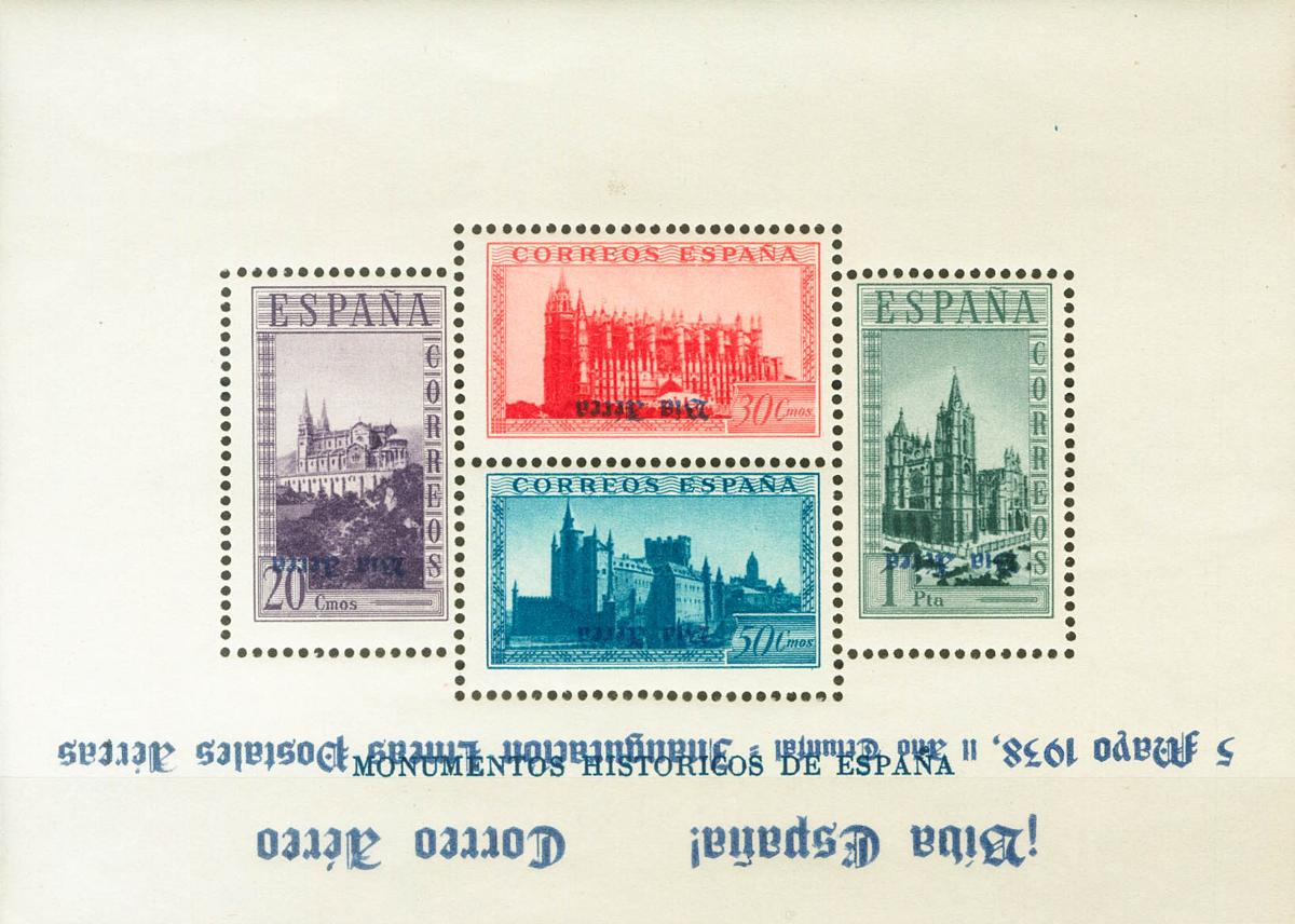 English ★★ 95There. 1938. Sheet block (Type II). REVERSED OVERLOAD. MAGNIFICENT. Edifil 2017: 185 Euros
