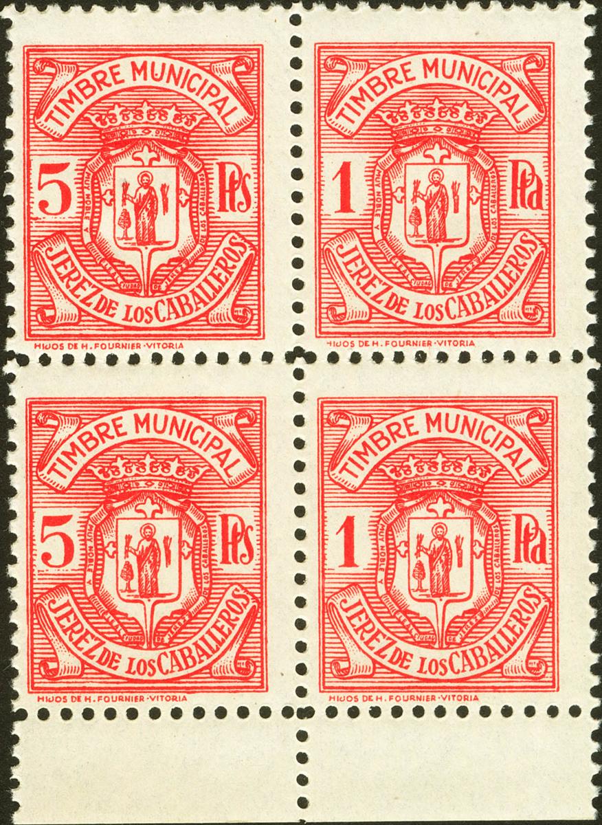 English ★★(1939ca). 5 rose red sts, two stamps and 1 rose red sts, two stamps, joined as a block of four. MUNICIPAL STAMP-JEREZ DE LOS CABALLEROS. MAGNIFICENT AND RARE IN BLOCK.