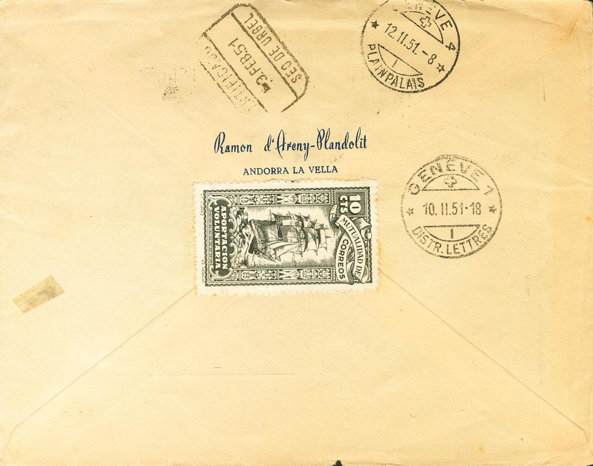 48(2), 54(2). 1951. 20 lilac cts, two stamps and 1 vermilion pts, two stamps. Certificate from ANDORRA LA VIEJA to GENEVA (SWITZERLAND). On the back arrival. MAGNIFICENT.