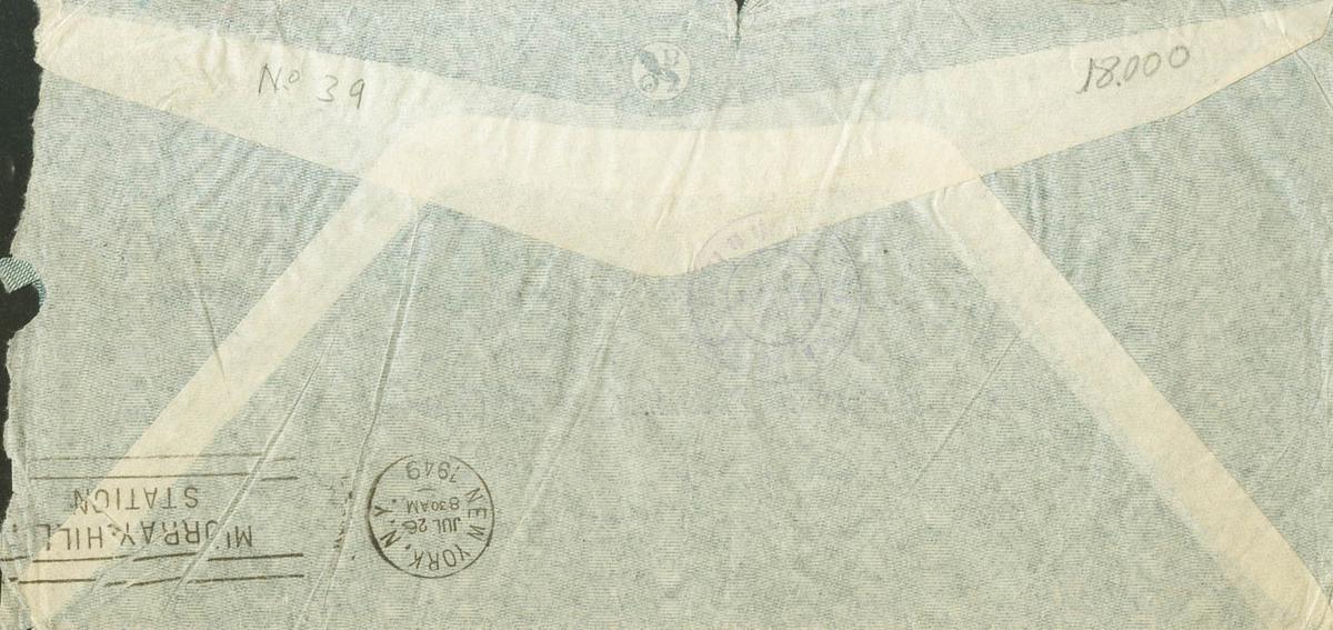42, 54(2). 1949. 4 carmine pts, 1 vermilion pts, pair and green stamp of 15 cts from Spain. ANDORRA THE OLD to NEW YORK (USA). On the back arrival. MAGNIFICENT AND RARE POSTAGE.