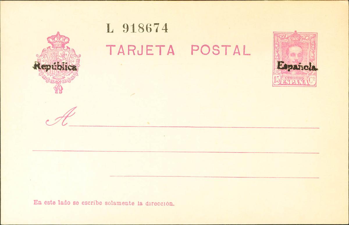 (★) EP66. 1931. 15 cts lilac Entire Post Card envelope (manual overprint). MAGNIFICENT. Edifil 2023: 102 Euros