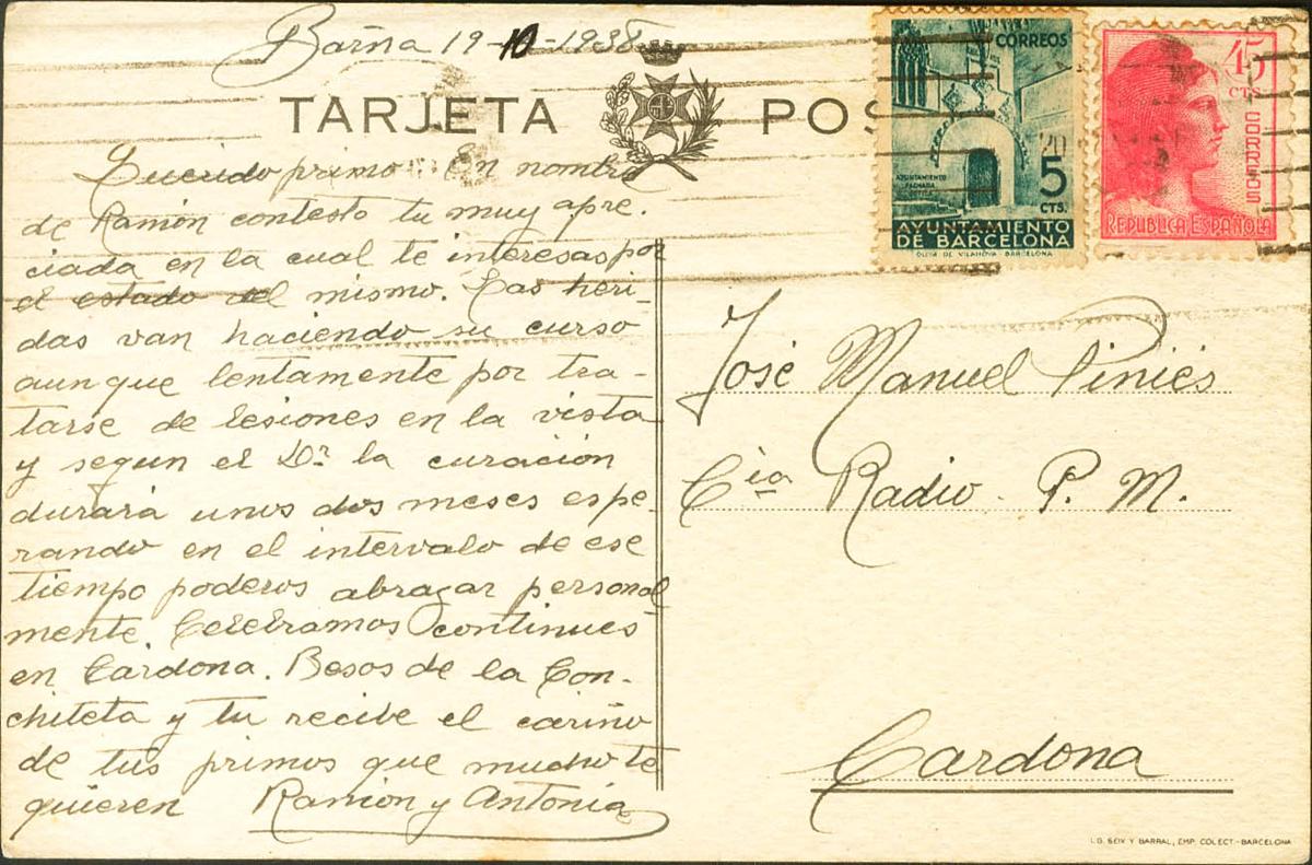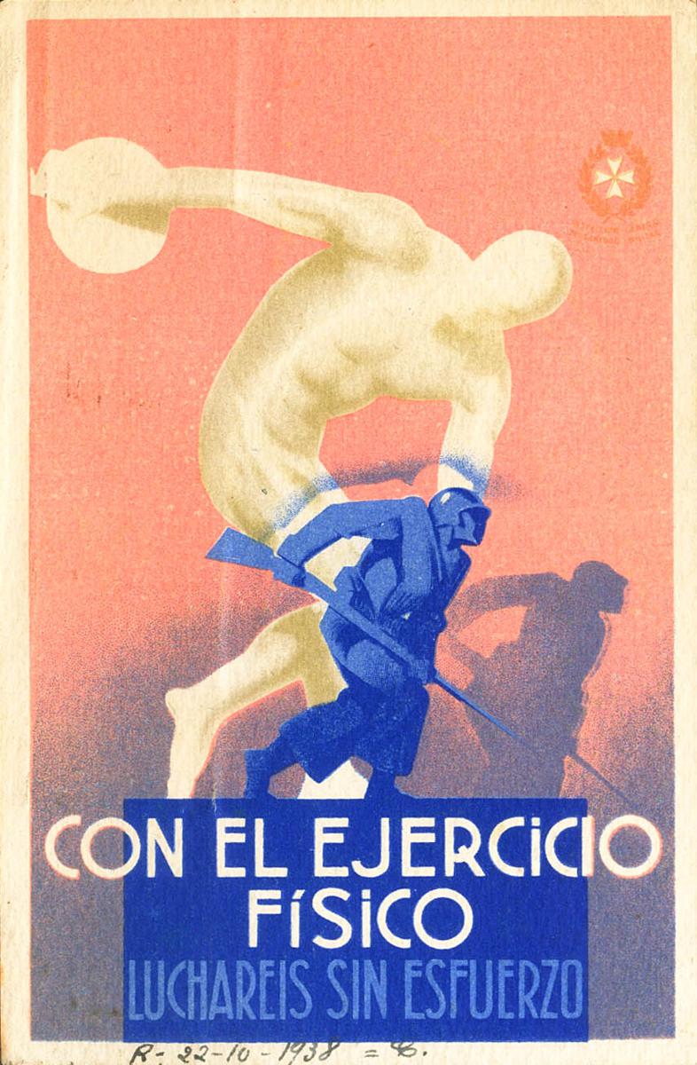 English 1938. 45 cts pink and 5 cts blue green. Illustrated Postcard "WITH PHYSICAL EXERCISE YOU WILL FIGHT WITHOUT EFFORT" from BARCELONA to CARDONA. MAGNIFICENT AND RARE. (Allepuz 1265)
