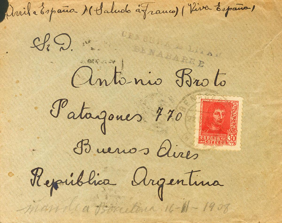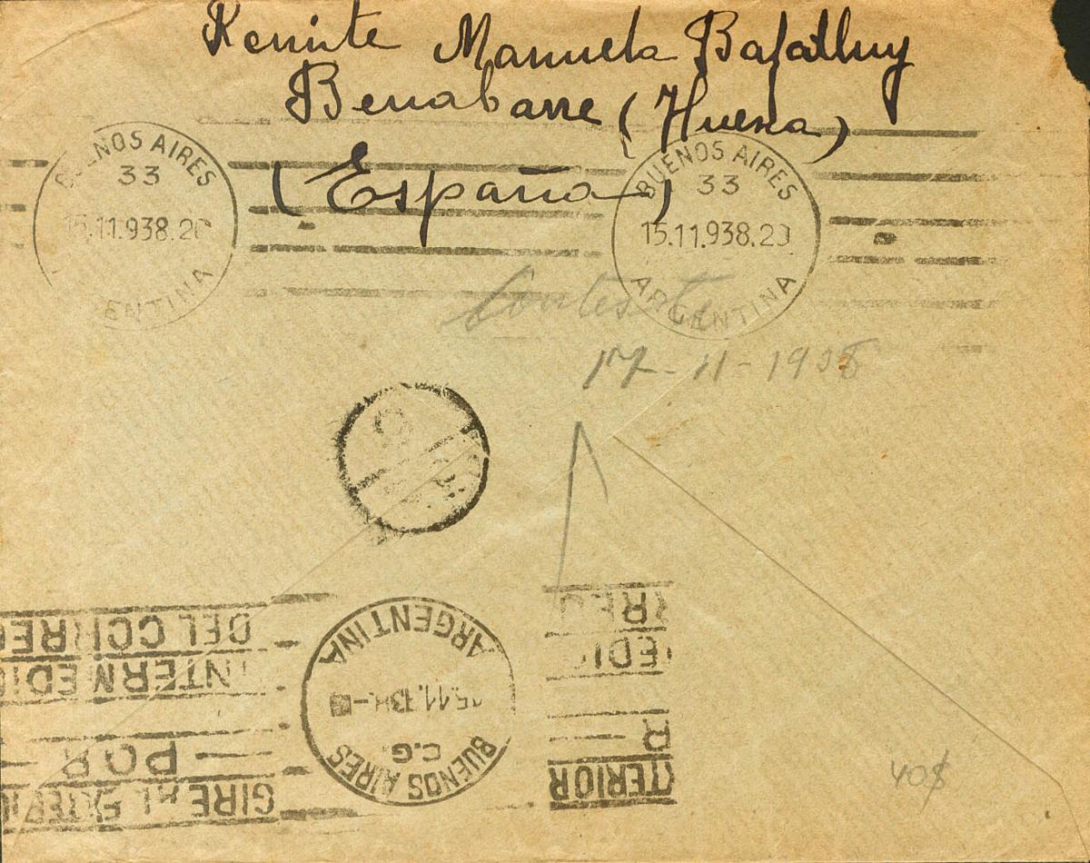 844. 1938. 30 cts red. BENABARRE (HUESCA) to BUENOS AIRES (ARGENTINA). On the front it marks MILITARY CENSURE / BENABARRE, in black and arrival on the back. MAGNIFICENT AND VERY RARE.