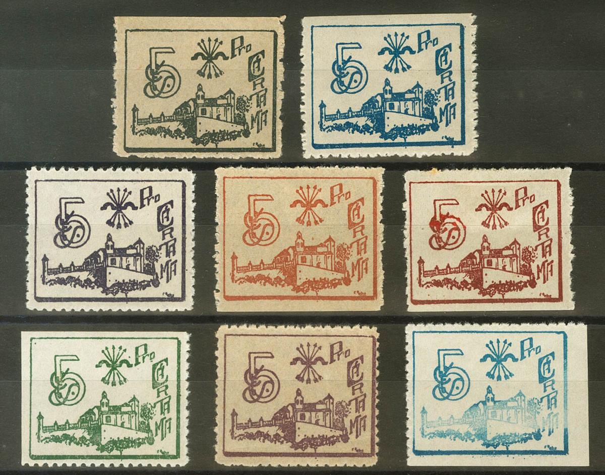 English ★/(★)(1938ca). Complete series, eight values, includes the unlisted sky blue 5 cts. CARTAMA (MALAGA). MAGNIFICENT. (Fesophi 1/7)